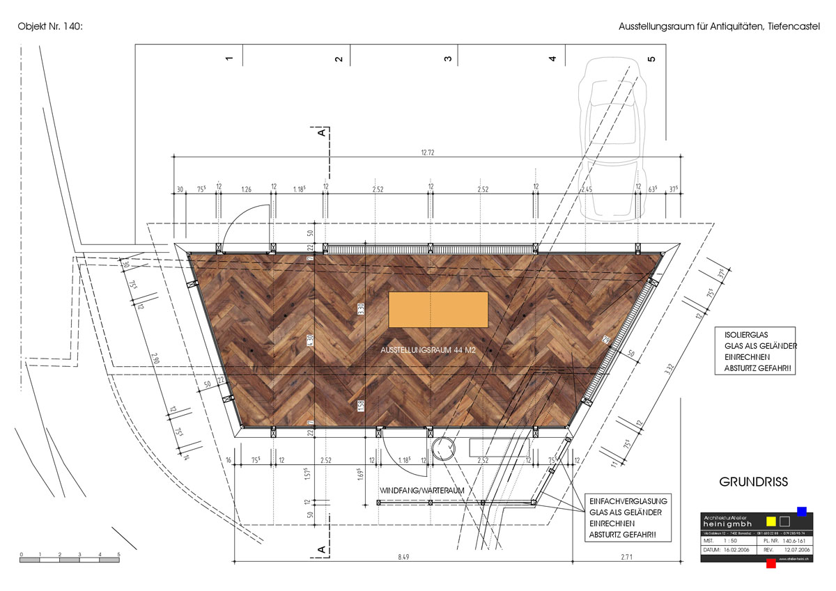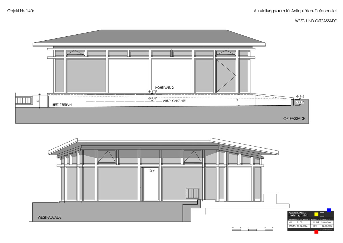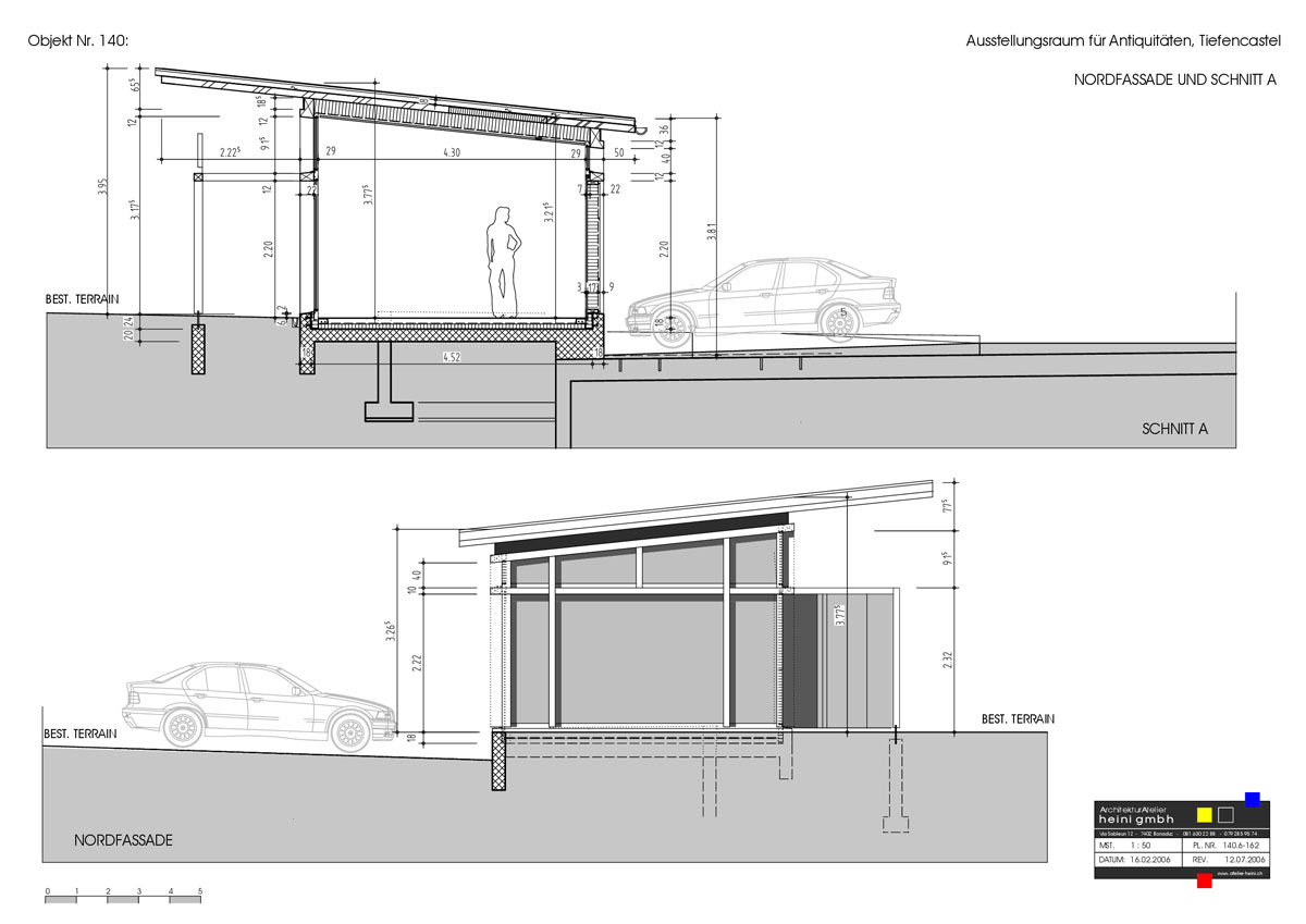 Die Bauherrschaft suchte nach Lösungen zur Realisierung eines Ausstellungsraums für Antiquitäten auf einer kleinen, unförmigen Restparzelle, die nicht mehr anderweitig genutzt werden konnte.