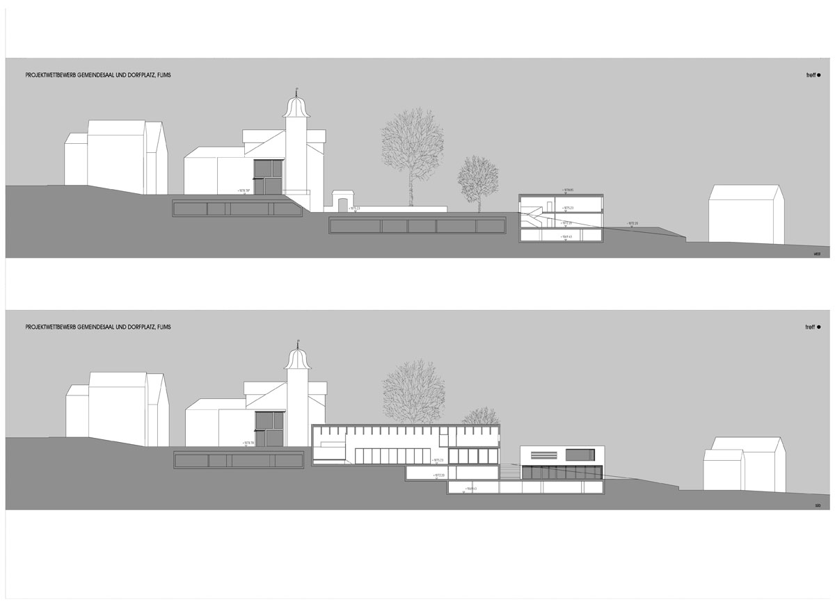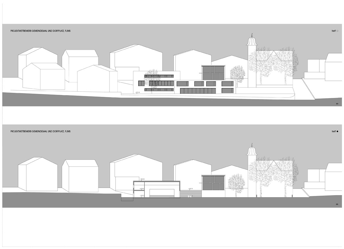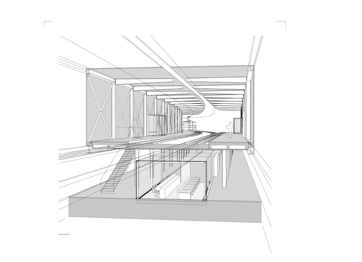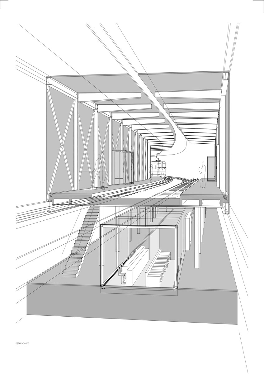 Die projektierten beiden überdachten Perrons markieren den Ort und stehen wie zwei Zugskompositionen in einem spannungsvollen Zusammenhang. Durch die versetzte Anordnung der Perrons wirken sie wie zwei in den Bahnhof einfahrende Züge und verleihen dem Projekt eine gewisse Dynamik.