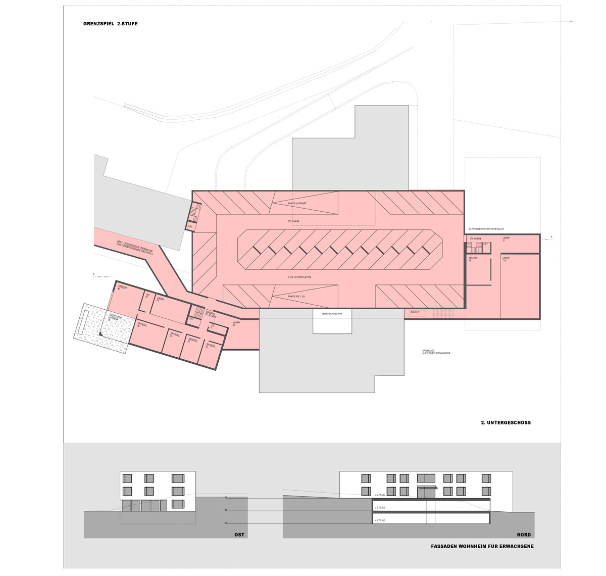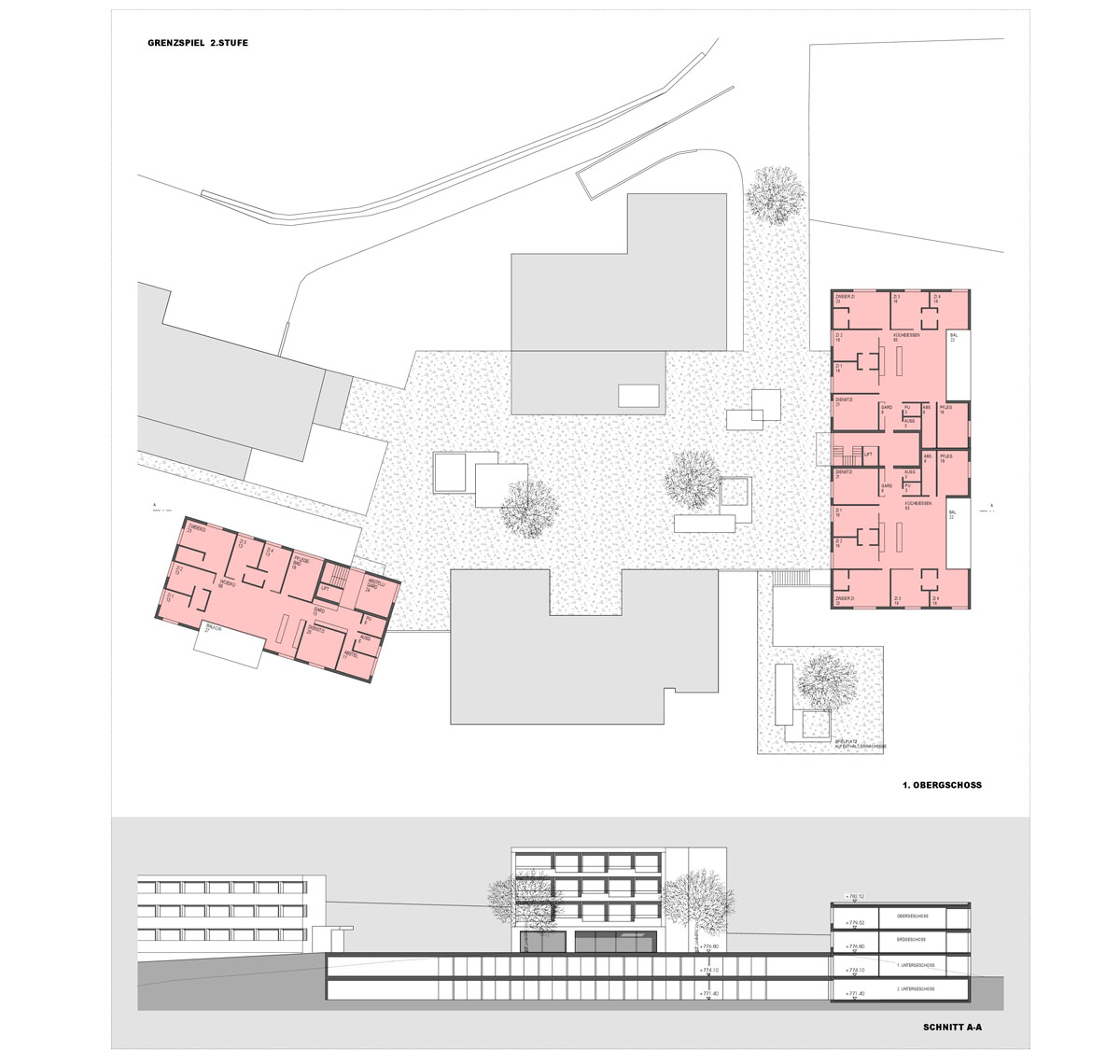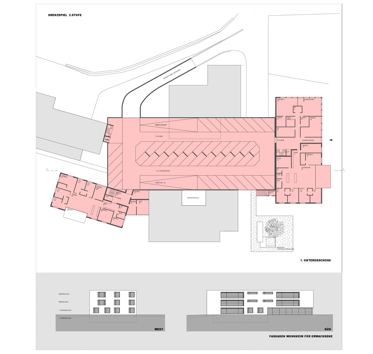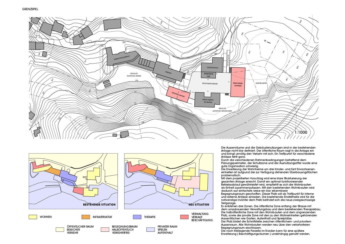 Die eindeutigen Nutzungen der Bauten definieren eine deutliche Zonierung der Anlage in öffentliche, halböffentliche und private Bereiche. Entlang der Straße befinden sich das Personal-, Therapie- und Verwaltungsgebäude mit Cafeteria. Die Einfahrt zur Tiefgarage liegt strategisch zwischen Personalhaus und Straße, während die bestehenden Parkflächen entlang der Straße weiterhin genutzt werden.