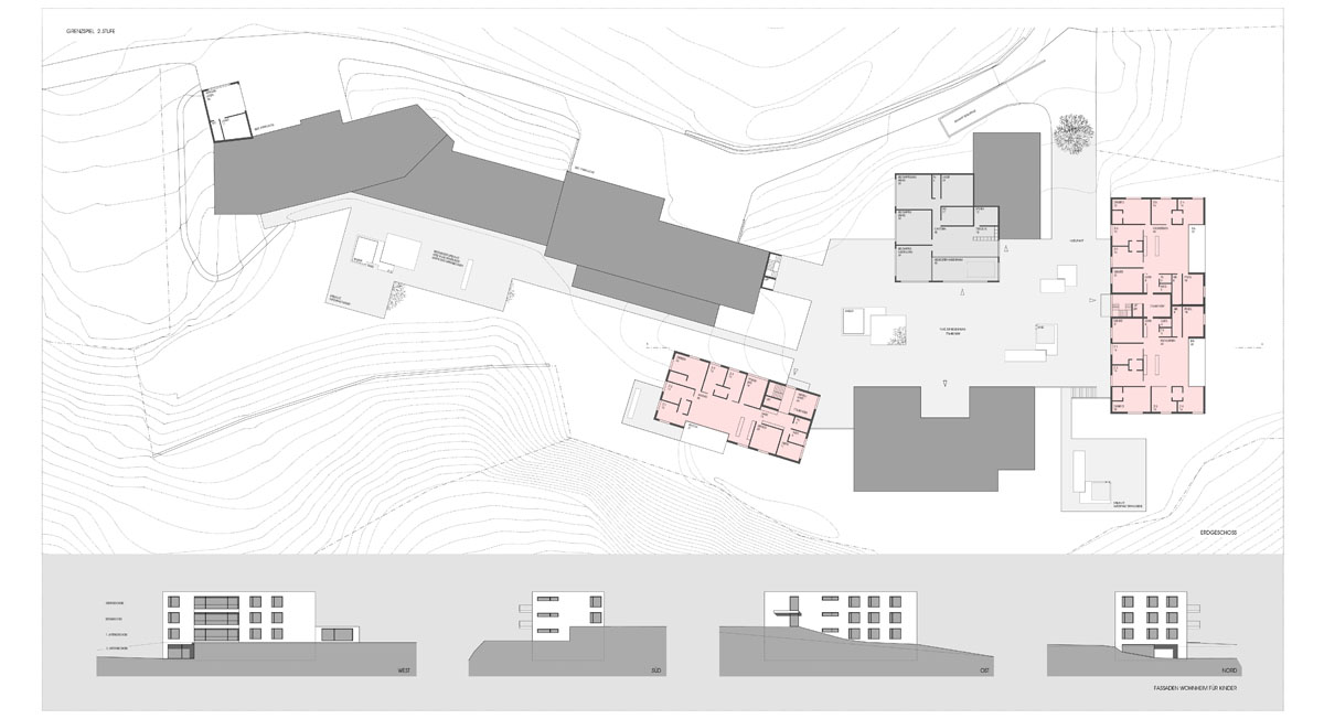 Durch die Einbindung der beiden neuen Gebäude – Kinder- und Erwachsenenwohnheim – entsteht ein strukturiertes Ensemble, das einen würdigen Abschluss zum Dorf Scharans bildet. Die Neubauten nehmen mit ihrer Materialisierung den muralen Charakter der bestehenden Anlage auf und fügen sich harmonisch in das Gesamtbild ein.