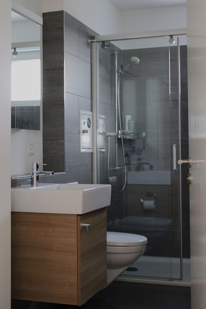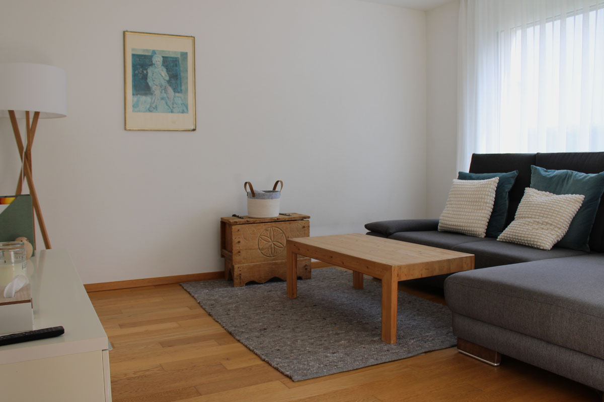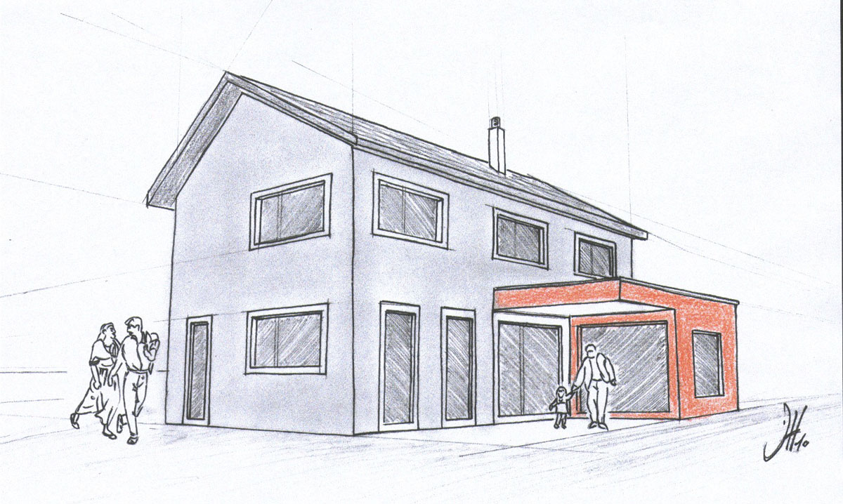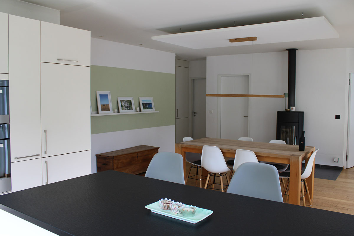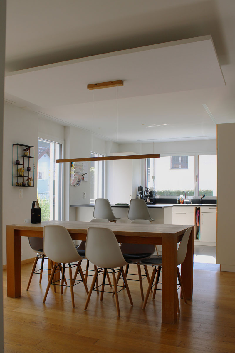 Die Bauherrschaft wünschte sich einen großzügigen Treffpunkt und einen geschützten Aussensitzplatz. Diese Anforderungen wurden durch den zentralen Ess- und Kochbereich als kommunikativen Mittelpunkt des Hauses umgesetzt. Der Fernsehraum wurde aus dem Hauptgebäude herausgeschoben, wodurch eine geschützte Sitzplatznische entstand. Diese architektonische Lösung reduziert zusätzlich die Einblicke vom benachbarten Mehrfamilienhaus auf ein Minimum.