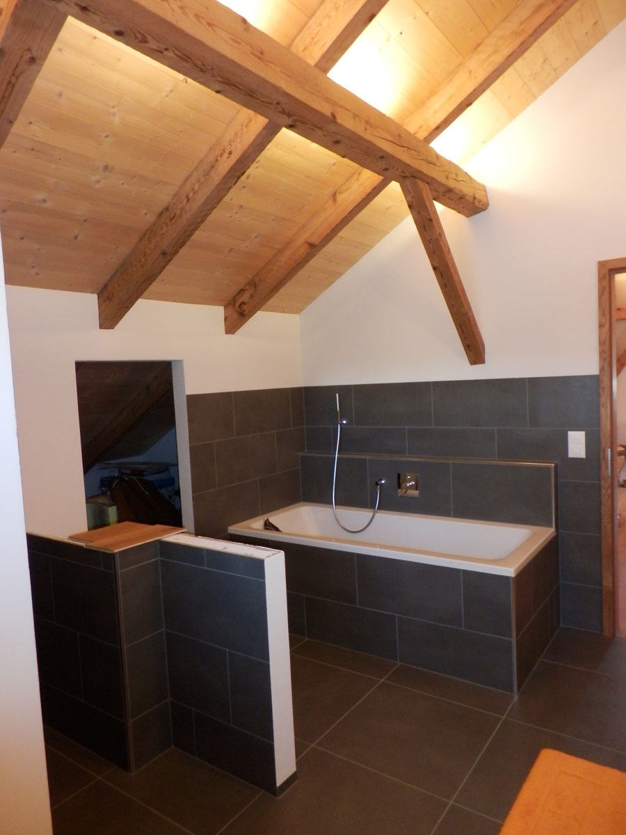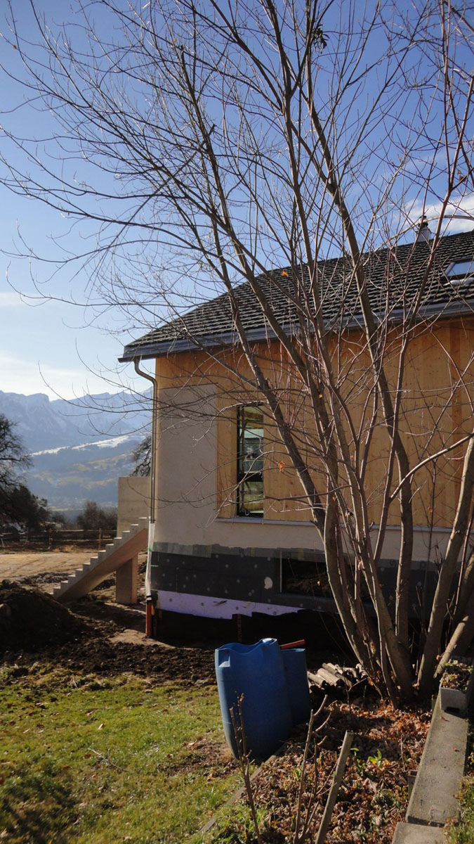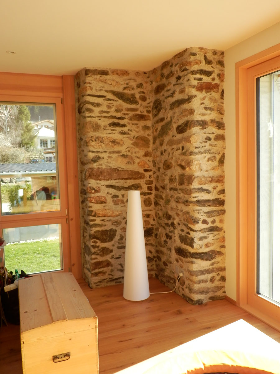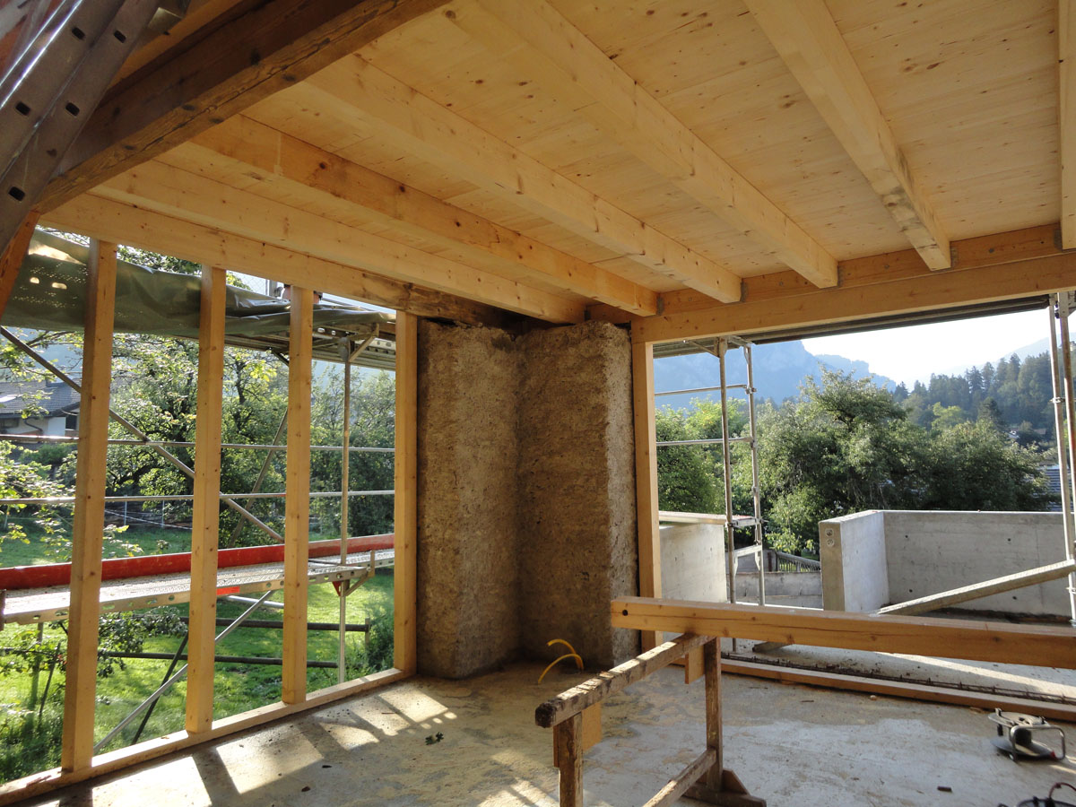 Die Bauherrschaft legte besonderen Wert auf naturbelassene Baustoffe. Wände und Decken wurden mit Lehm verputzt, was zu einem besonders angenehmen Raumklima beiträgt. Als Wärmedämmung kamen im Außenbereich hauptsächlich Holzdämmplatten und im Innenbereich Schafwolle zum Einsatz. Diese nachhaltigen Materialien überzeugen durch ihre baubiologischen Eigenschaften und schaffen ein aussergewöhnlich behagliches Wohnklima.